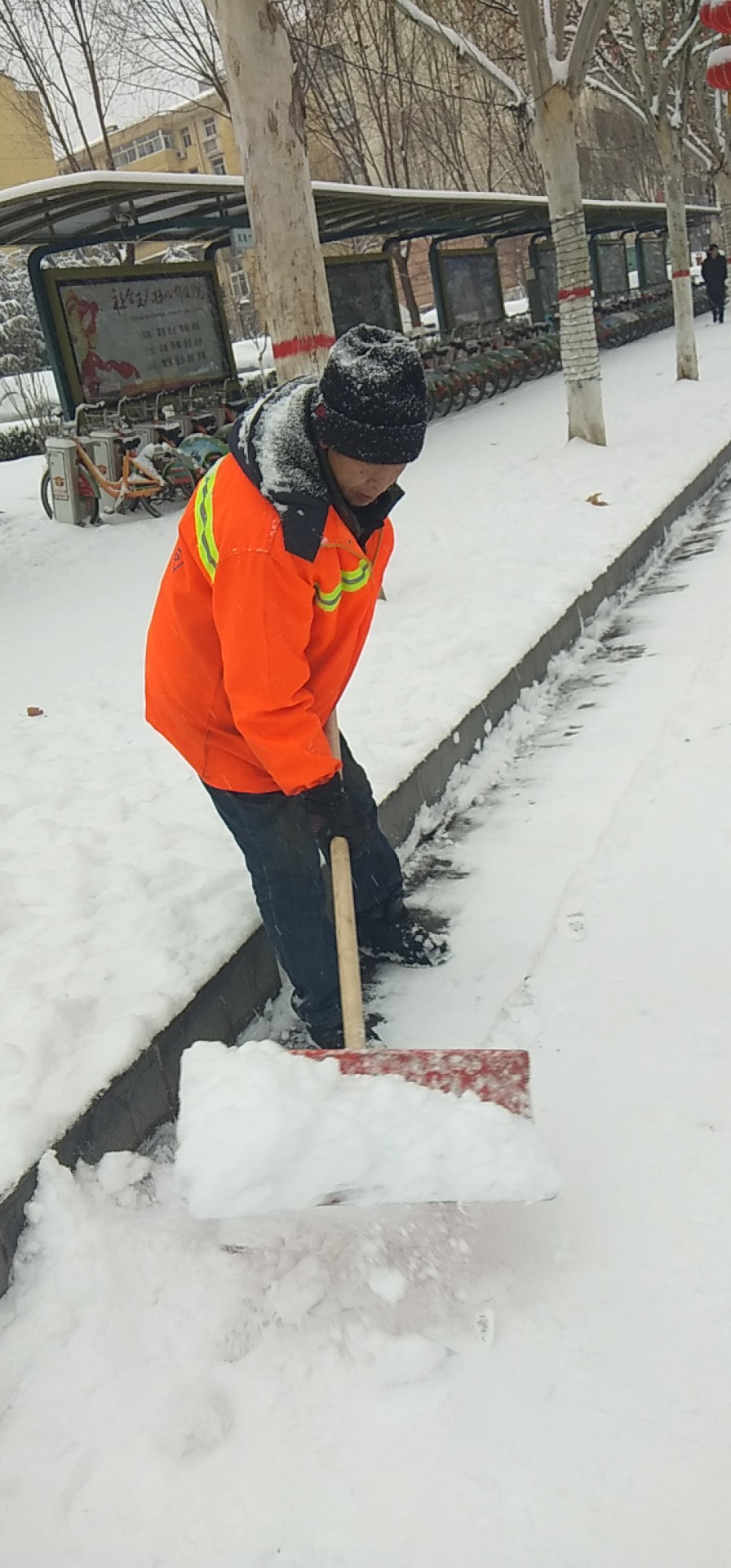 為保障大家出行安全,認(rèn)真鏟除地面殘冰。