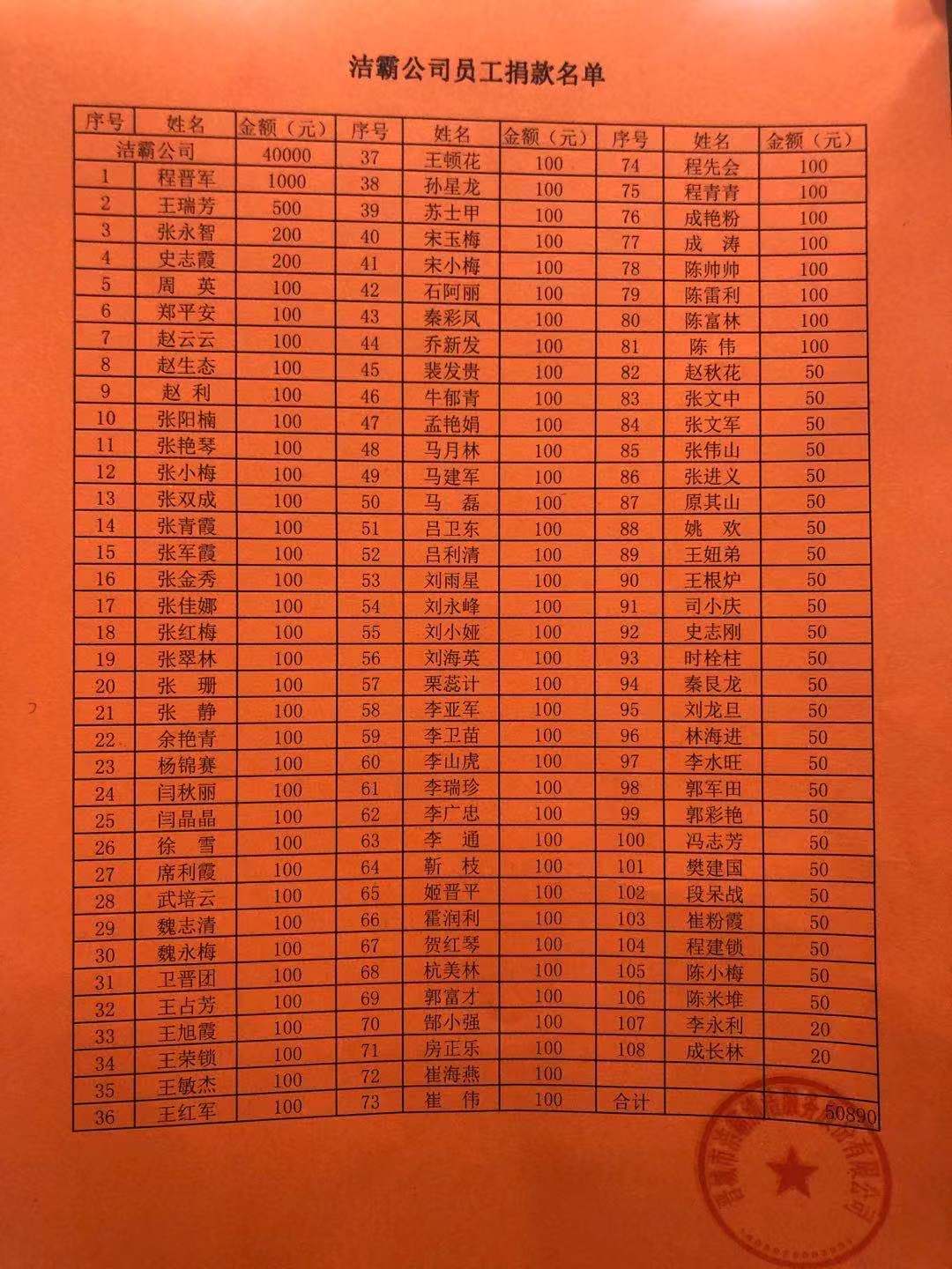 捐款倡議書在“潔霸一家人”群發(fā)布后,大家踴躍參與。公司班子成員率先垂范,帶頭捐款,全體干部員工勠力同心,慷慨解囊,凸顯了潔霸人的責任與擔當。