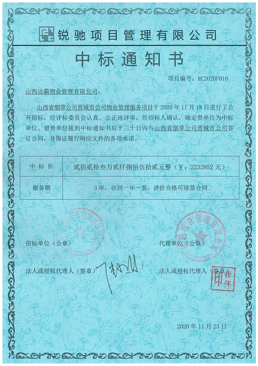 2020年11月18日,山西省煙草公司晉城公司物業(yè)管理服務(wù)項(xiàng)目開標(biāo)會(huì)議在晉城市文昌東街1560號(hào)南環(huán)供電營業(yè)站一樓東會(huì)議室舉行。在經(jīng)過幾個(gè)小時(shí)的激烈競標(biāo)過程評(píng)選后,從開標(biāo)室傳出喜訊,山西潔霸物業(yè)管理有限公司成功中標(biāo)。中標(biāo)金額為2232852元,合同期一年。此次中標(biāo)為潔霸物業(yè)今年的業(yè)績?cè)偬硪还P輝煌。