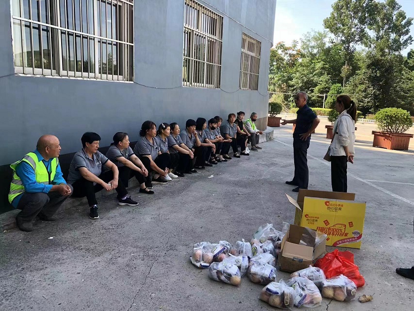 工會(huì)主席崔偉一行先后走訪萬達(dá)廣場(chǎng)、山西科技學(xué)院、晉城市金鳳凰廣場(chǎng)、鳳西廣場(chǎng)、白馬寺、青蓮寺、陽城北留潔霸洗業(yè)等地,對(duì)戶外高溫下作業(yè)的高空清洗員工、物業(yè)保潔員工、環(huán)衛(wèi)員工、園林綠化員工及洗衣廠員工等一線勞動(dòng)者進(jìn)行慰問。崔主席充分肯定了高溫下堅(jiān)持奮戰(zhàn)在一線員工的敬業(yè)精神,感謝他們?yōu)闈嵃浴皯?zhàn)高溫、斗酷暑”付出的辛勤勞動(dòng),并將面包、桃子、白糖等慰問品送到員工手中,讓高溫下堅(jiān)守在一線的員工感受到來自潔霸大家庭的關(guān)愛。