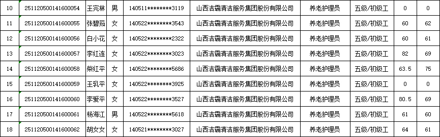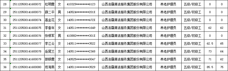 山西潔霸清潔服務(wù)集團(tuán)股份有限公司職業(yè)技能等級(jí)認(rèn)定中心2025年11月23日第5批養(yǎng)老護(hù)理員初級(jí)認(rèn)定人員成績(jī)公示